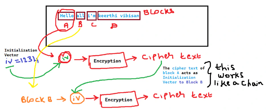 This is the most used encryption mode, here initially to encrypt we mix the data/text with Initialization Vector (IV) which is a random generated, for next block the previous Cipher data/text acts as Initialization Vector. This ensures no block get same encryption result.